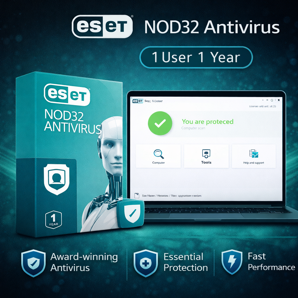 ESET NOD32 is a lightweight antivirus option for users who want essential malware protection without unnecessary system load. Delivered digitally for one user over one year.